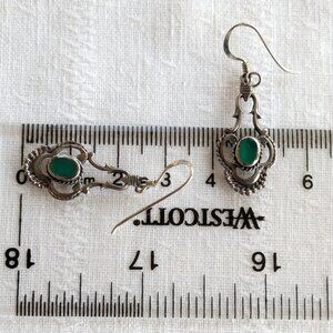 4) $20. Delicately made sterling dangle earrings set with small shiny cabochons in deep translucent jade green. They weigh 3 grams and measure 36 x 14 mm. "925" is stamped on the wire.