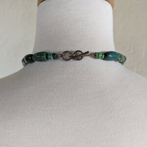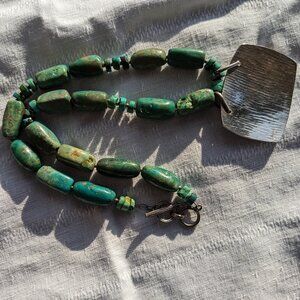 1) A striated silver pendant, signed "Thai Barse 925," hangs between roughly polished blue-green stones. The necklace is 17 inches long, ending in a sterling toggle closure, and weighs 64 grams.