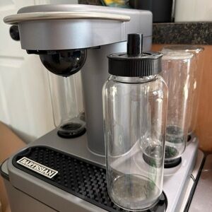 Bartesian cocktail machine. Sleek silver finish for a modern look. Easy-to-use design delivers consistent cocktails every time. Compact and stylish for home bars. Includes recognizable branding and silver color.