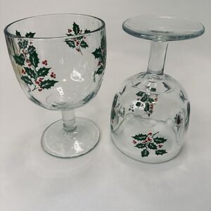 Bartlett Collins 16oz Thumbprint Glass Holly Berry 6" Goblets Set of 2 Christmas Holiday