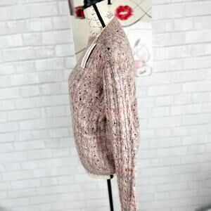 Bartolini Italy NWT Chunky Knit Wool Blend Puff Long Sleeves Sweater Size Large. Rose Multi-color. Pullover style sweater with a chunky open knit construction, long puff sleeves, and crew neckline. Ribbed detailing around the neckline, cuffs, and hemline. Hand-knitted with care and precision. Stylish, cute, and cozy, this sweater is perfect for staying warm and fashionable during the colder months. Made in Italy.