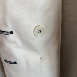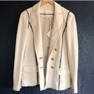 Japanese designer. Lapel collar double breasted blazer coat with long sleeves made of pure wool. It is cream colored with black stitching. Features front flap pockets that may also be tucked in, exposed stitching, back vent (still stitched), and front double breasted gold toned button closure. In excellent condition - new with tags. *Tagged Sezane for exposure