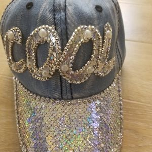 The cap has the word "COOL'' written across the top portion with White Pearls decorating each letter. The bib of the cap has two rows of Faux Diamonds. The Baseball Cap is "SUPER DUPER CUTE" 🤗