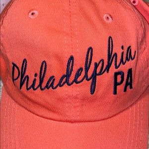 -philadelphia hat is a coral color and pink hat is pink with navy blue writing