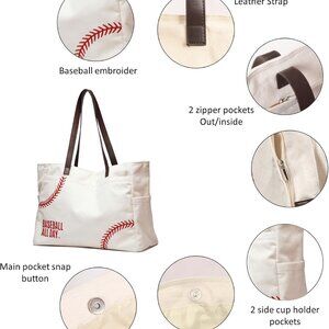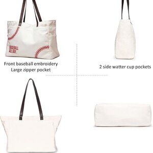Features: Large-capacity canvas tote with multiple pockets, including a zippered back compartment, side baseball cup and umbrella pockets, and a lined interior. Double faux leather handles with a 12-inch drop make it easy to carry. Stylish and durable, ideal for moms, players, coaches, and fans supporting their team.