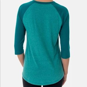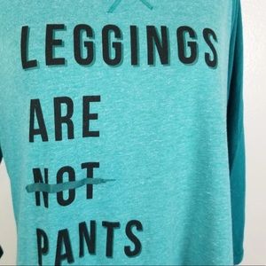 Adorable greenish/teal baseball raglan t-shirt with the words "leggings are NOT pants" with the NOT crossed out because we all know leggings ARE pants, ha!