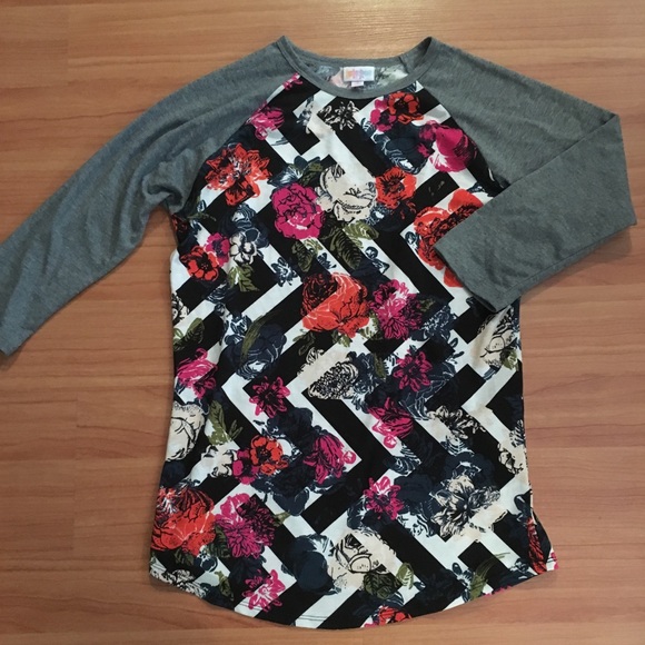 Black and white chevron with pink, blue, orange and green floral on top. The sleeves are gray.