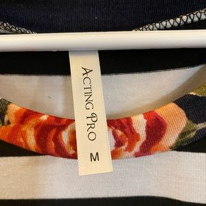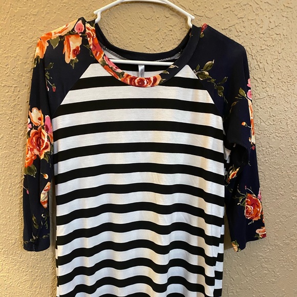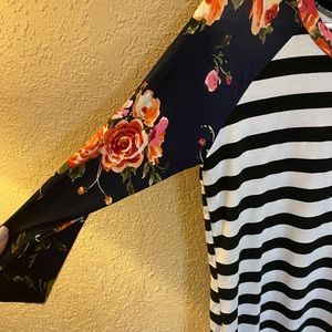 Black & white striped shirt with navy floral sleeves baseball T! Size M. SO CUTE so soft. Leggings material sleeves.