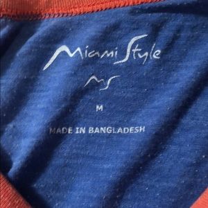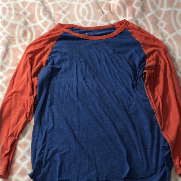 This is a blue and orange baseball style tee! It is a size medium but is very forgiving! It is a three-quarter length sleeve