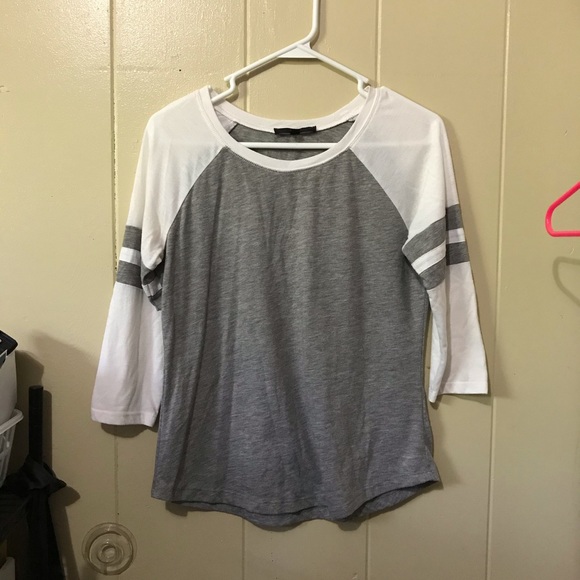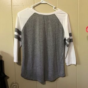 Small stain in back of neckline Varsity stripes (2) on sleeves Size Large (runs small) so fits smaller