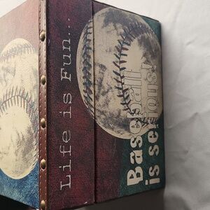 Decorative box with baseball design. Features text 'Baseball is serious!' and 'Life is Fun.' box measurement 12 inches wide 8 inches in length 6 inches tall