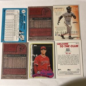 Set of six baseball trading cards featuring various players. Vibrant colors and team logos.