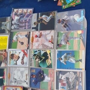 Assorted baseball trading cards. Features various players and teams. Perfect for collectors.