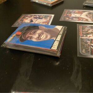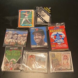 Collection of baseball trading cards featuring various players. Includes cards with colorful designs and player images.