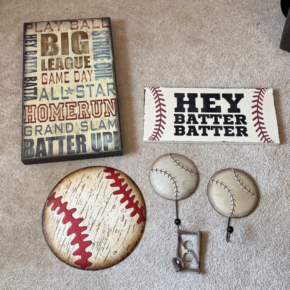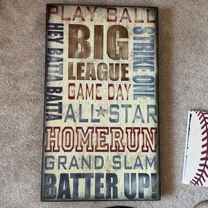 Vintage-style baseball wall art. Features bold text and classic phrases. Perfect for sports enthusiasts.