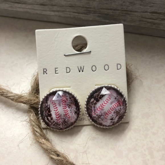 Baseball stud earrings with silver trim. Comes with both metal and rubber backings.