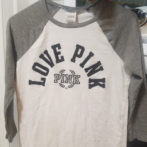 Victoria Secret Pink baseball tee with 3/4 sleeves. There is a very tiny stain on the front of the shirt. (Shown in pic) other than that it's in good condition.