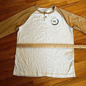 Baseball tee, size small. Light brown and white colors, with a Quicksilver logo on the chest. In excellent used condition, no rips tears or stains.