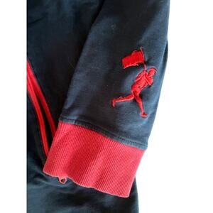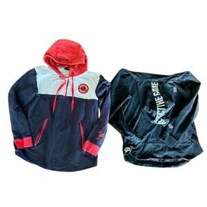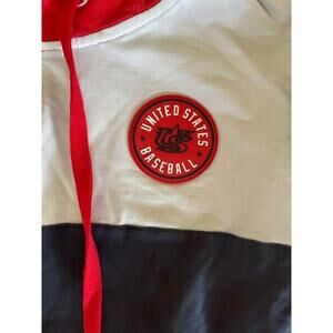 Colorblock hoodie in navy, white, and red with “United States Baseball” chest patch, contrast red zip pockets, red drawstrings, and embroidered flag runner logo at the cuff. Both are soft cotton-blend pieces in good pre-owned condition.