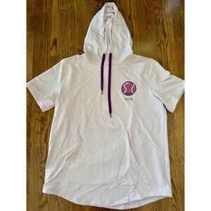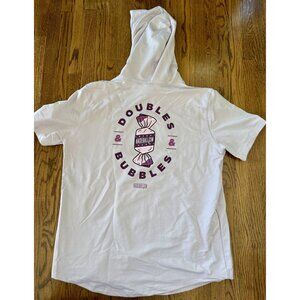 Looking to channel your inner slugger while staying cozy? This Baseballism short sleeve hoodie is a home run. With a playful grape baseball design and "Doubles & Bubbles" on the back, you’ll look like an all-star, even if you’re just lounging. Slight wear adds character—it's pre-loved, like your favorite baseball glove.
