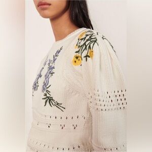 Cut in a boxy silhouette, this puff-sleeve sweater is enhanced by intricate floral embroidery and openwork knitting.