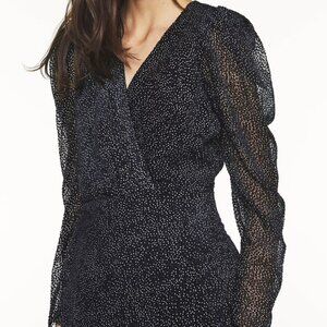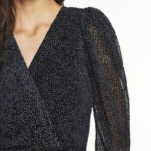 Feminine style for the CHARLIE dress. Cut in a beautiful dévoré velvet type fabric, this long dress multiplies feminine details. The mutton sleeves and back are sheer. The crossover neckline and front slit bring an additional seductive touch. A long dress that's perfect for evenings.