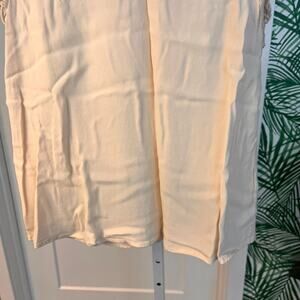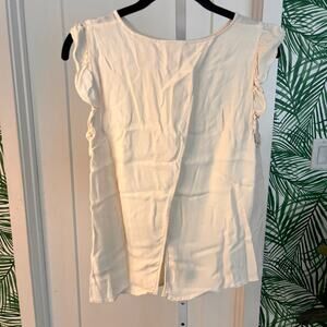 White crepe (100% Viscose). Top. Flutter sleeves. Crew neckline. 25" from shoulder to hemline. Imported.