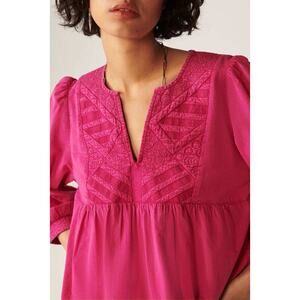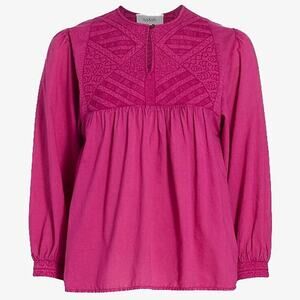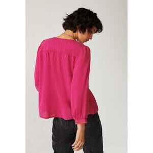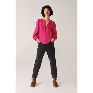 The vivacious ILO blouse by ba&sh inspires exotic destinations. This blouse has a round neckline with one button then plunges into a split and 3/4 sleeves with gathering on the shoulders. The cotton is treated for a slightly worn effect. Check out the trendy front and back bibs which are padded and embroidered with matching thread and trimmed with gathering under the seam for pretty volume. An embroidered blouse with exotic influences that looks divine over jeans or a printed skirt.