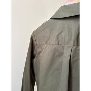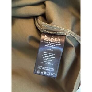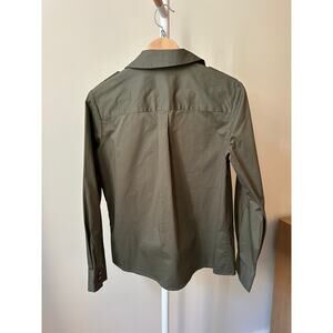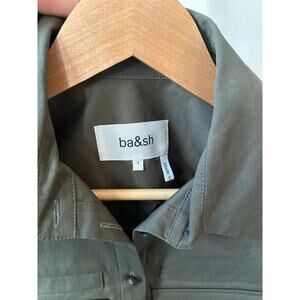 Classic Ba&sh utility-style shirt in soft olive khaki cotton. Designed with a tailored silhouette, pointed collar, button front, and flap chest pockets for a structured yet effortless look. Subtle shoulder tabs and cuffed sleeves lend a modern, safari-inspired edge.
