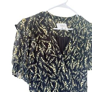 Black floral printed crepe (100% Viscose). Hourglass. Short sleeves. V-neckline. Elastic waistband. Partially lined. 36" from shoulder to hemline. Imported.