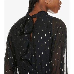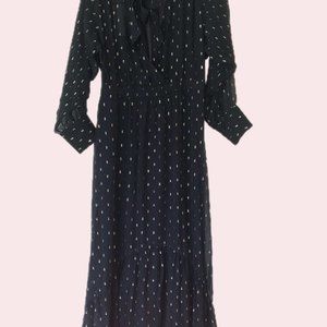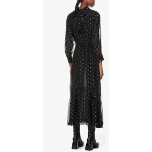 High neck, long puff sleeves, mother-of-pearl buttons, structured waistband, all-over metallic pattern, flared hem, ties at back neck, open at back, partially lined