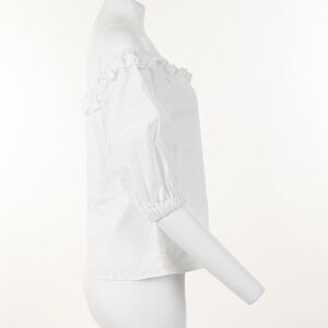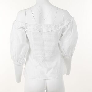 Design details: ruffle neckline, smocked back, puffed elbow-length sleeves