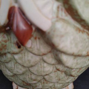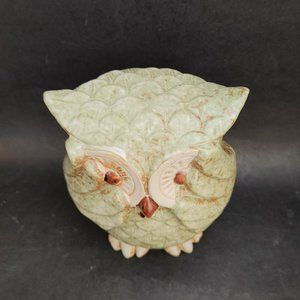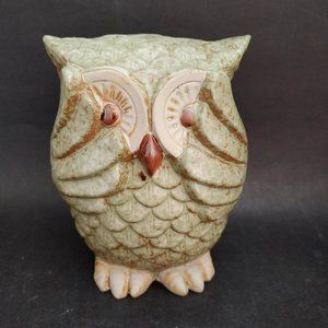 Adorable Bashful Owl Figure Ceramic Green w/ Brown Retro Whimsical Peek-A-Boo. Measures approx. 6.75" tall by 5" wide and 4" deep at the largest areas. In Good Condition. One minor glaze chip at the base of the beak. Please see last picture. No other cracks, chips or breaks.