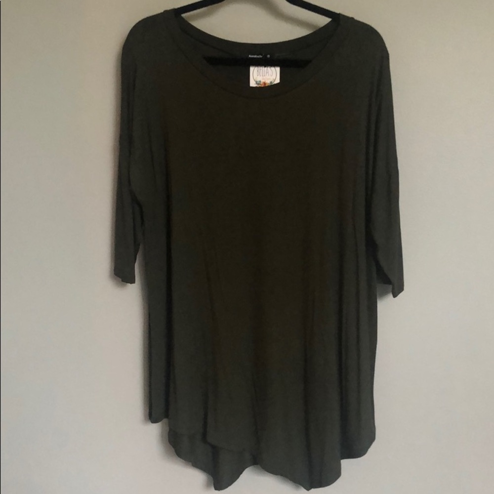 Olive green top with asymmetrical hem line. Can totally size down in this!