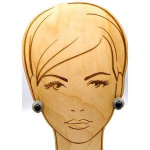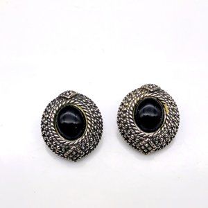 Basic Black Cabochon Earrings in Silver Tone Frames, Neutral Vintage Chic Clip