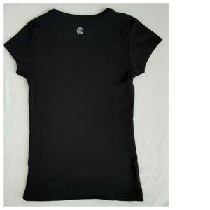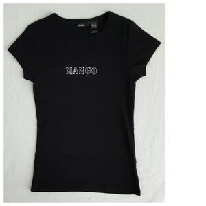 Cute black Tee by Mango. See model for fit - but note that the lettering of the logo is a bit different (the logo to the right of the model is on the T-shirt that is for sale). Fabric is 100% cotton (but I cut out the fabric label because it was scratchy, see photo). Worn once briefly, laundered cold, delicate cycle and air dried (no fading, no shrinkage). Excellent condition. Would keep this - but accidentally bought the wrong size and noticed only when I wore it. Approx. measurements: length 22", bust 13".