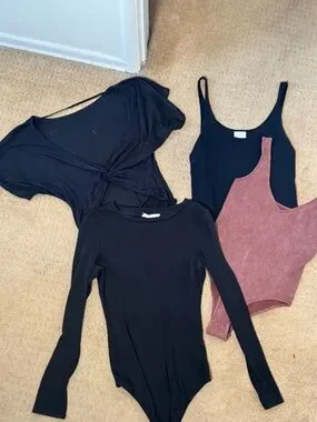 All size large - basic black and tan bodysuits - misc boutique brands - used condition, pricing adjusted to reflect, still plenty of life left in them. From a pet free smoke free home