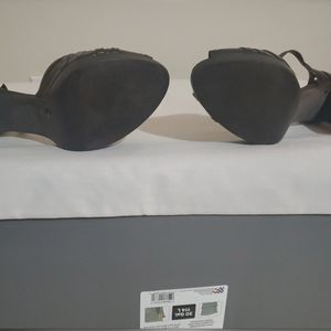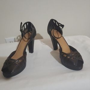Partial open toed and closed heel. Brown block heel with an ankle strap.