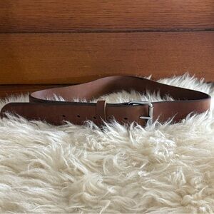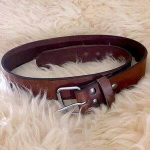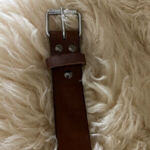 This belt is thick, heavy tan leather with a silver buckle, in great condition. No makers marks, unisex in style.