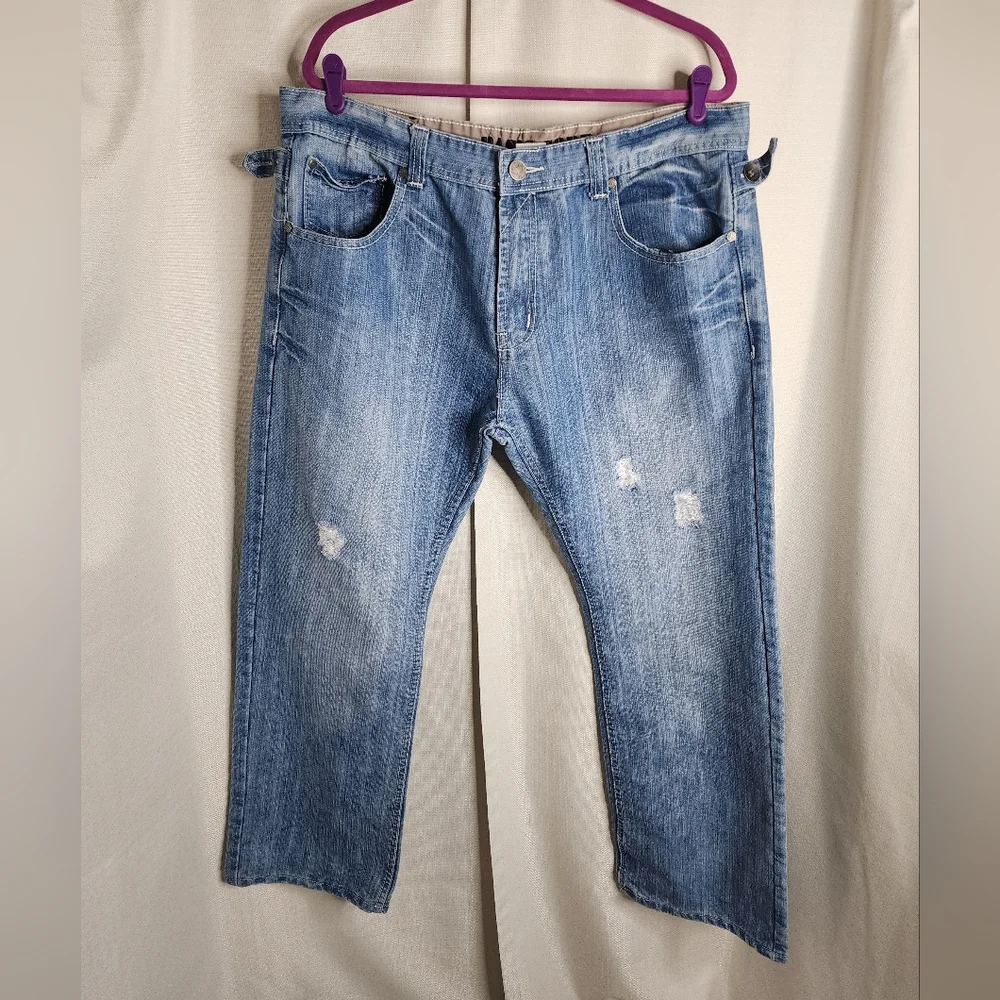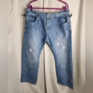 Blue, relaxed jeans. Men's size 42x32, with a 11" rise. Excellent used condition.
