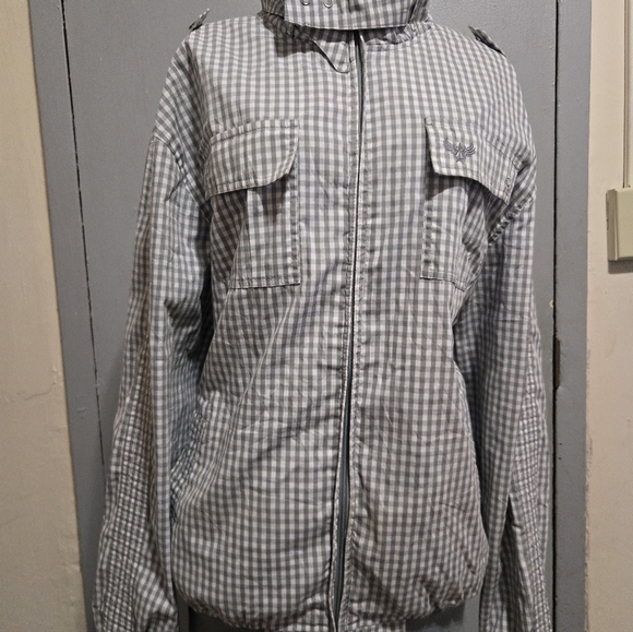 Lightweight men's zip-up jacket in a subtle gray gingham check. Features chest flap pockets and a high collar for added coverage. Comfortable, casual layer ideal for everyday wear. Neutral gray pairs easily with jeans or chinos.