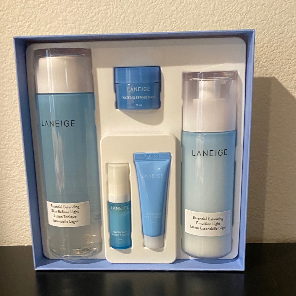 Welcome to the ultimate hydration experience with the amazing LANEIGE Basic Duo Set. Say goodbye to dull and lackluster skin as this set works its magic to bring back your skin's natural radiance and dewy glow. The moisture balancing set includes three essential products: the Essential Balancing Skin Refiner Light, Essential Balancing Emulsion Light Lotion, Water Sleeping Mask, Water Bank Hydro Essence and Water Bank Hydro Cream. Each product is specifically formulated to deliver intense hydration and moisture to your skin, providing you with the ultimate hydration routine. New