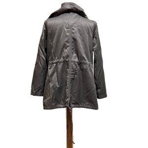 Basic Edge lightweight jacket in a silver grey color - fabric has a subtle iridescent sheen. Long sleeves have roll-up tabs. Adjustable waist drawstring with plastic toggles. Two pockets at front of hips (zippers at chest are decorative - not real pockets). Full zip front closure. Removable hood. 75% cotton/20% polyester/5% metallic, machine washable. Women's size Large - see below for garment measurements.