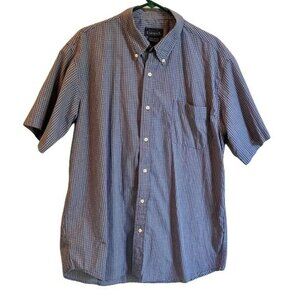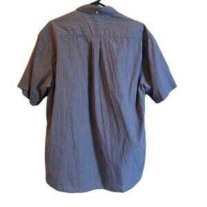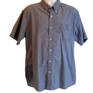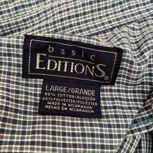 Basic Editions Short Sleeve Button Down Blue Shirt 55% Cotton, 45% Polyester. Size Large with Approximate measurements laying flat: 24" pit to pit, length 31 ".