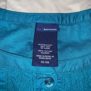 Very cute teal blouse with lace and buttons. Material doesn’t have much stretch which is why it doesn’t fit me right.
