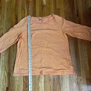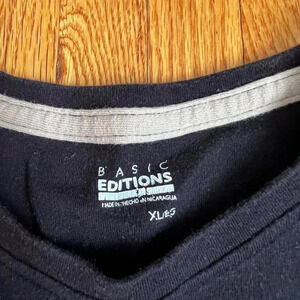 Basic Edition shirts (2), size XL. One black short sleeve shirt and one quarter sleeve orange and white striped shirt. In good used condition, no rips tears or stains.