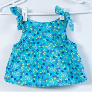 Adorable 2 piece outfit by Basic Editions. Top features ties at the shoulder with matching tie front bloomers. Excellent condition. Baby girl size 24 months. *Note, this does seem a bit small for 24 months and the fabric does not have any give to it.