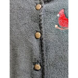Black fleece button-front cardigan with red cardinal and branch embroidery. Round neckline with gold-tone buttons and two front pockets.