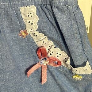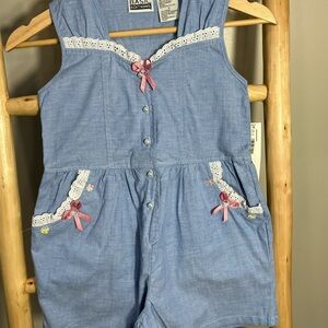 Charming blue romper for kids by Basic Editions. Features delightful pink accents and lace details. Perfect for playful days.