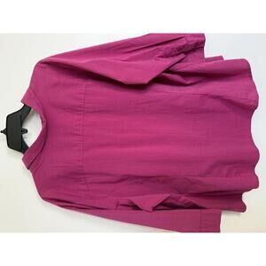 Rich magenta blouse with subtle vertical pinstripes and a relaxed, flattering fit. Lightweight with a soft drape and 3/4 sleeves. Easy to style tucked in or worn loose. Very Good Condition!